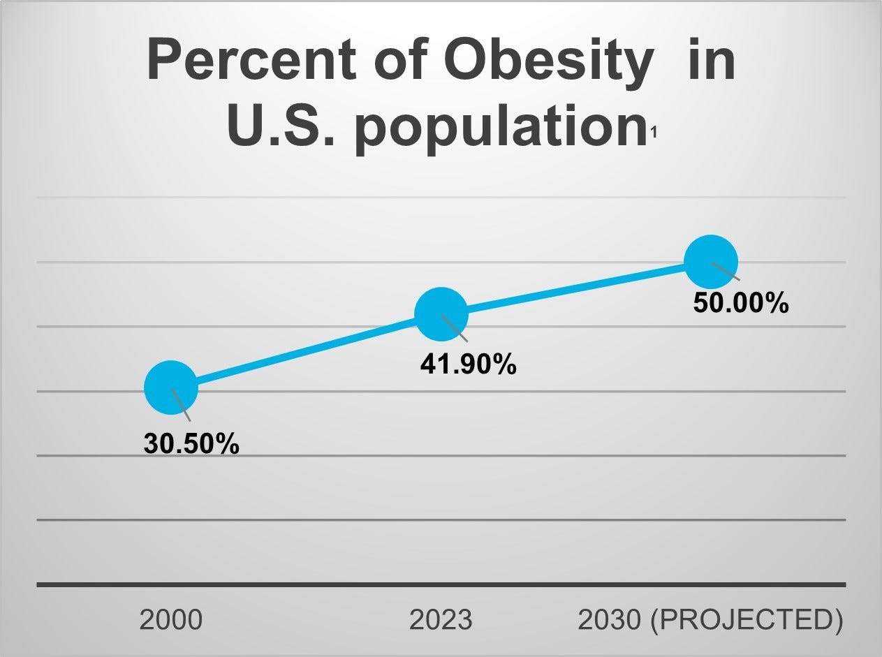 Washington, DC - Obesity has increased from 30% of the US population in 2000 to 42% in 2023. Projections show this increase will continue and reach 50% by 2030 [1]. A multi-billion-dollar weight loss and exercise industry has been developing for several decades, yet the obesity rate continues to increase and been linked to $1.4 trillion in annual costs![8]