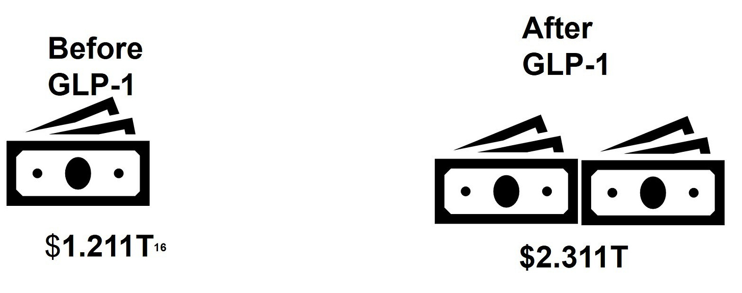 My financial analysis demonstrates that prescribing GLP-1 to all obese patients does not provide an adequate return on investment. Even with the 20% decreases in body weight and the research that shows a reduction in body weight of 5-10% significantly lowering chronic disease incidence [8], the numbers just don’t work out. The US commercial healthcare population spends $1.1T [16] on healthcare annually. If all people with obesity were to take GLP-1 drugs, the annual healthcare costs would DOUBLE!